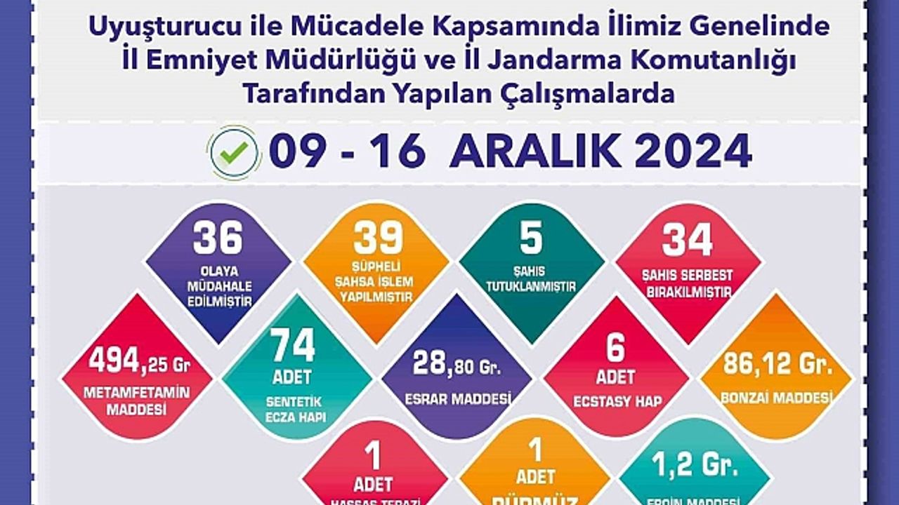 İl Emniyet Müdürlüğü ve İl Jandarma Müdürlüğü ekipleri tarafından 9-16 Aralık tarihlerinde yapılan uyuşturucuyla mücadele çalışmalarında 36 olaya müdahale edilerek, 39 şüpheli şahsa işlem yapıldı. Şüpheli şahıslardan 5''i tutuklanırken; 34 şahıs ise serbest bırakıldı. Ayrıca, bu kapsamda 494,25 gram metamfetamin maddesi, 74 adet sentetik ecza hapı, 28,80 gram esrar maddesi, 6 adet ecstasy hap, 86,12 gram bonzai maddesi, 1 adet hassas terazi, 1 adet pürmüz ve 1,2 gram eroin maddesi ele geçirildi.