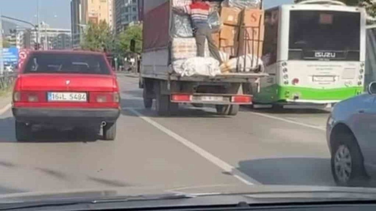 Merkez Osmangazi ilçesi Haşim İşçan Caddesi üzerinde evden eve eşya taşıyan kamyonet yürekleri ağza getirdi. Kamyonetin kasasında eşyaları tutan vatandaşı gören sürücüler gözlerine inanamadı. Bir süre tehlikeli şekilde giden kamyonet ara sokaklara girerek gözden kayboldu.