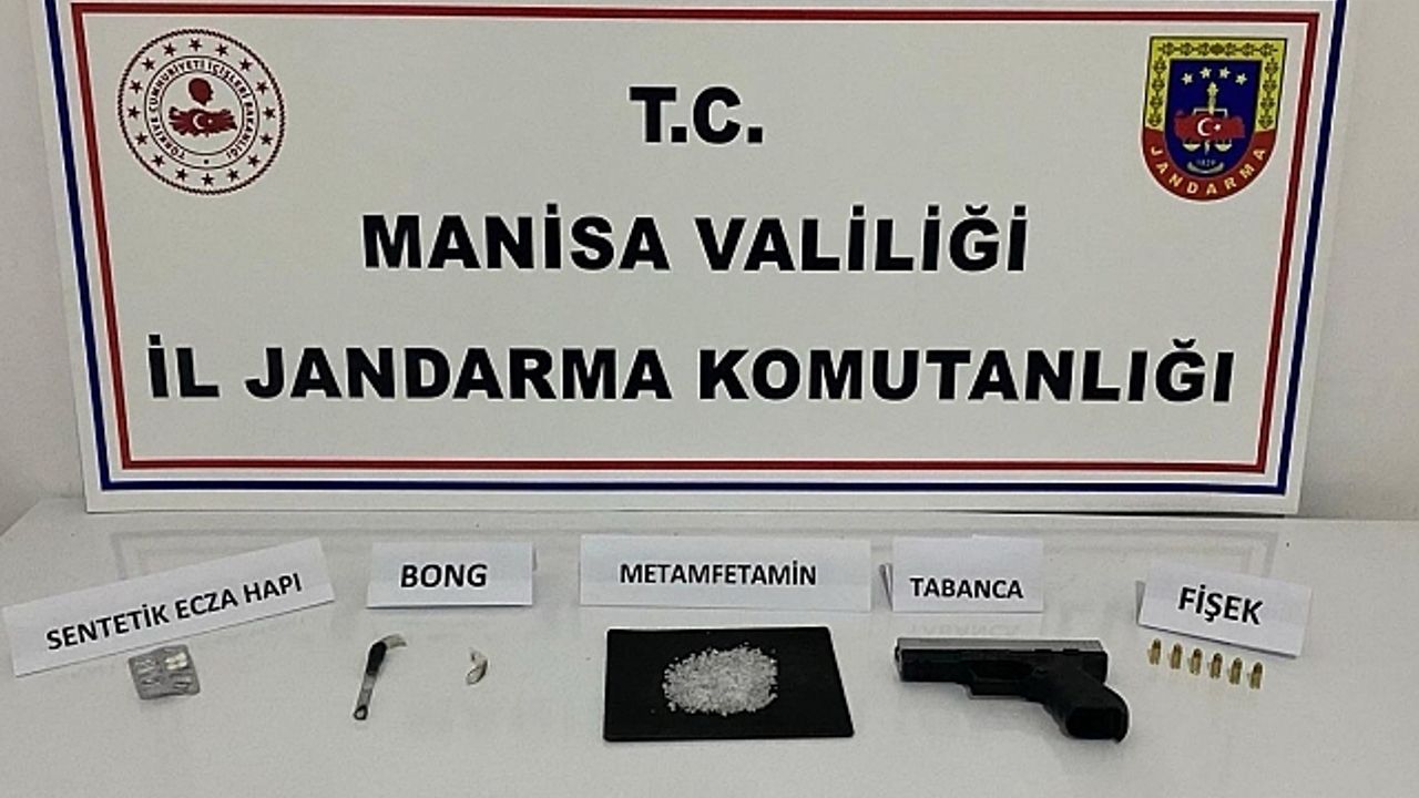 Manisa''nın Yunusemre ilçesinde jandarma ekipleri tarafından bir şahsın ikametinde yapılan aramada uyuşturucu maddelerle birlikte ruhsatsız tabanca ele geçirildi.