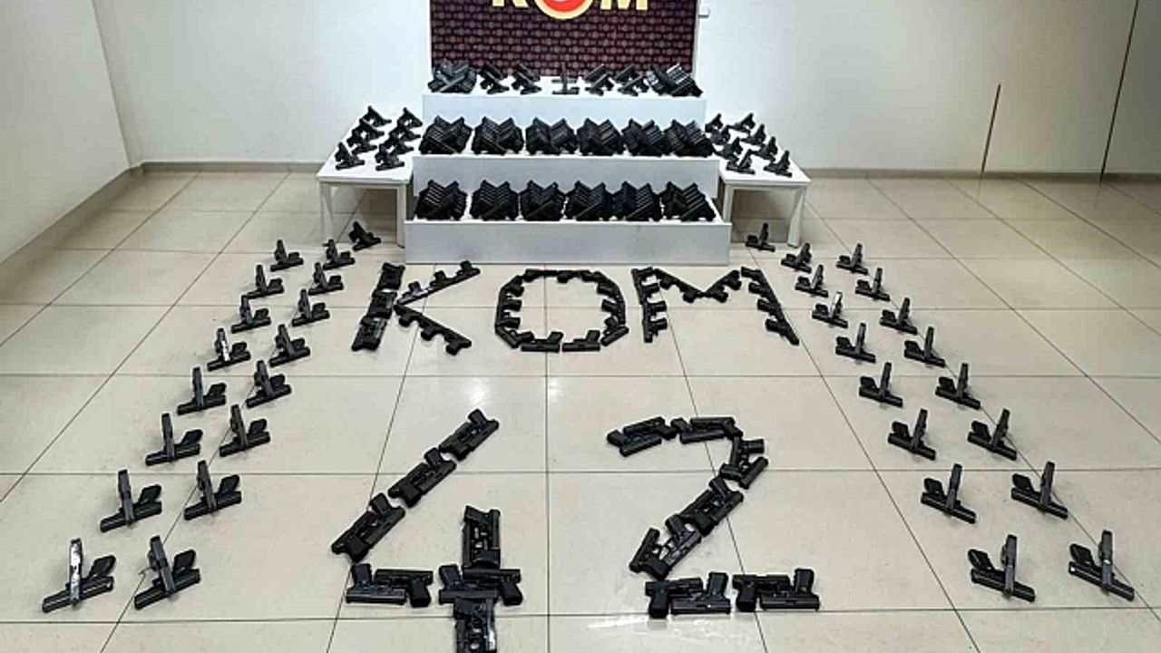 Konya Emniyet Müdürlüğü''ne bağlı Kaçakçılık ve Organize Suçlarla Mücadele Şubesi ekipleri tarafından düzenlenen operasyonda yüzlerce kaçak tabanca ele geçirildi. Olayla ilgili şüpheli baba ve oğlu tutuklandı.