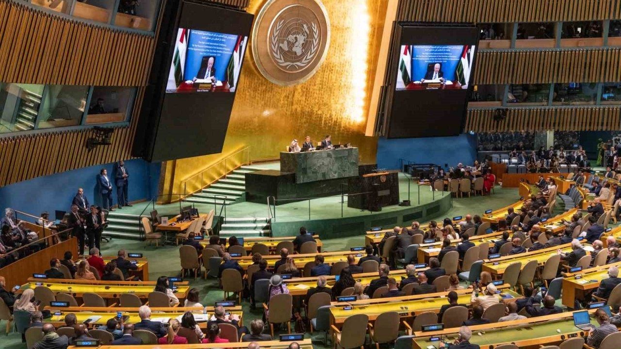 Filistin Devlet Başkanı Mahmud Abbas, BM Genel Merkezi"nde düzenlenen "Filistin Meselesine Çözüm Bulunması ve İki Devletli Çözümün Hayata Geçirilmesi Konulu Yüksek Düzeyli Uluslararası Konferansı"na ABD"nin vizesini iptal etmesi nedeniyle video mesaj yoluyla katıldı. Abbas, Filistin yönetiminin şeffaflığa ve hukukun üstünlüğünü güçlendiren kapsamlı bir reform gündemine bağlılığını yeniden teyit ederek, Gazze Şeridi"ndeki savaşın sona ermesinden sonraki bir yıl içinde devlet başkanlığı ve parlamento seçimleri düzenleyeceğine söz verdi. Otoriteden devlet yapılanmasına geçişi sağlamak için geçici bir anayasa taslağı hazırlayacağına söz veren Abbas, bu çerçevenin Filistin Kurtuluş Örgütü"nün siyasi programına ve uluslararası meşruiyete bağlı olmayan hiçbir parti veya kişiyi kapsamayacağını ve uluslararası gözetim altında olacağını açıkladı. Abbas, geçtiğimiz temmuz ayında BM Genel Kurulu"nda ezici çoğunlukla kabul edilen tarihi New York Deklarasyonu"nun kabulü için şükranlarını sunduğunu belirterek, bunu insani felaketi sona erdirmek, uluslararası meşruiyet ve Arap Barış Girişimi doğrultusunda işgali sona erdirmek ve başkenti Doğu Kudüs"ü olan, İsrail ile barış, güvenlik ve iyi komşuluk içinde yan yana yaşayan bağımsız bir Filistin Devleti kurmak için atılmış kararlı bir adım olarak nitelendirdi.