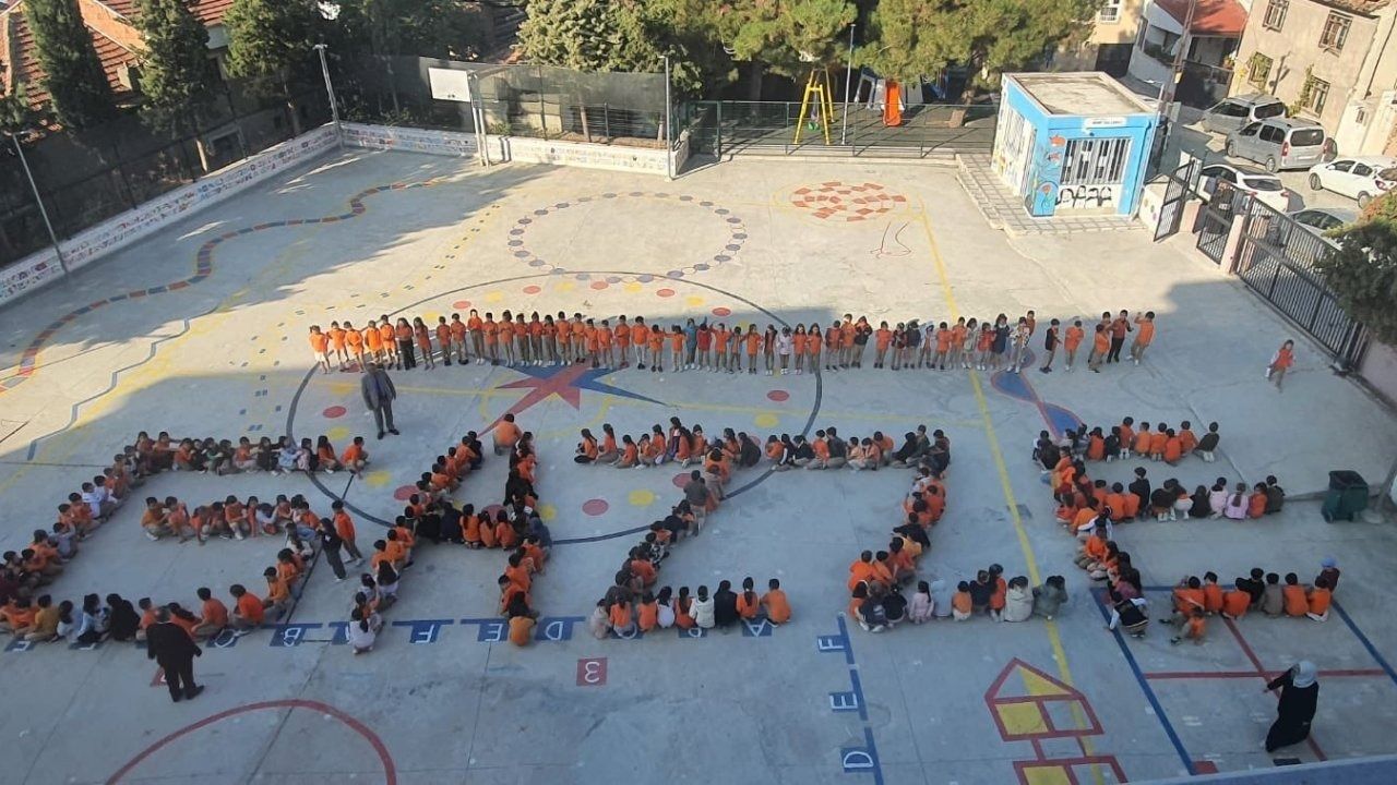 Etkinlik kapsamında öğrenciler, öğretmenlerinin rehberliğinde Filistin bayrakları taşıdı ve Gazze"de yaşanan insani dramın son bulması için temennilerde bulundu.