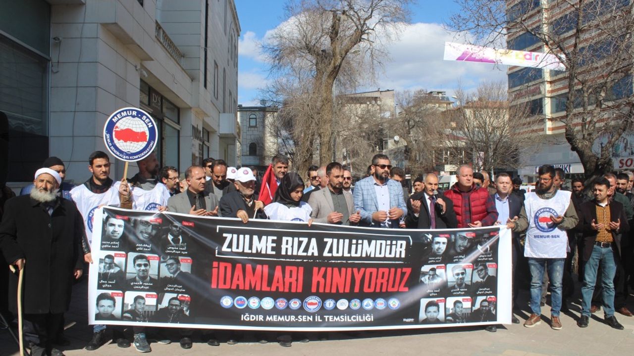 Memur-Sen Iğdır Şubesi tarafından Mısır"da idam edilen 9 gençle ilgili basın açıklaması düzenlendi. Atatürk caddesinde düzenlenen basın açıklamasında konuşan Erkan Çiğdem, “Maide Suresinin 32. ayetinde 'Kim, bir cana veya yeryüzünde bozgunculuk çıkarmaya karşılık olmaksızın (haksız yere) bir cana kıyarsa bütün insanları öldürmüş gibi olur. Her kim bir canı kurtarırsa bütün insanları kurtarmış gibi olur" buyruluyor. Mısır"da 16-17 Haziran 2012 yılında %51,73 oyla Cumhurbaşkanı seçilen Mursi hükümetine darbe yapan Sisi cuntası, meşru hükümeti savunmak için Rabia meydanında oturma eylemi yapan silahsız binlerce insanı katletmişti. Emperyalist dünyanın ve işbirlikçi bazı Arap ülkelerinin desteğini alan Sisi, dünyanın kör vicdanından ve ümmetin sessizliğinden güç alarak gittikçe daha da Firavunlaşmakta, Firavun"un Hz. Musa"nın kavmine yaptıklarının bir benzerini binlerce yıl sonra Mısır"da masum Müslüman kitlelere yapmaktadır. Darbeci Sisi hükümeti bugüne kadar göstermelik yargılamalarla idama mahkum ettiği 165 masum kardeşimizi idam etti. Mısır zindanlarında her an idam edilmeyi bekleyen 600 kişi var. Üstelik ağır işkenceler eşliğinde ve de çelik kafesler içinde savunma hakkı verilmeksizin yapılan yargılamalar devam ediyor ve kurulan yargı tiyatrosunda yeni idam kararları veriliyor. Cunta yargısı daha geçen Eylül ayında aralarında Muhammed Biltaci"nin de bulunduğu 75 kişiyi daha idama mahkum etti. İdam kararlarını tüm dünyanın gözleri önünde sessiz sedasız uygulayan Sisi cuntası bu kadar ölümlere rağmen kana doymuyor. Geçtiğimiz günlerde de 9 genç, cunta tarafından haksız yere idam edildi” ifadelerini kullandı.