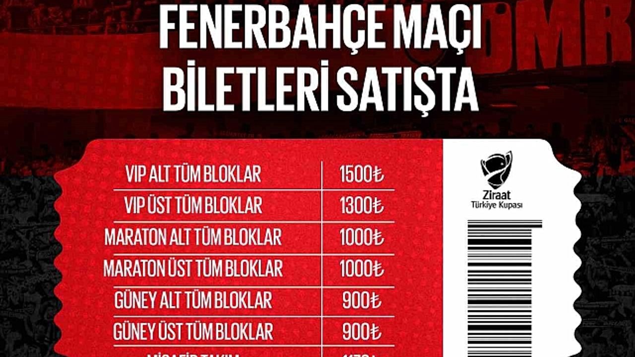 Gaziantep Futbol Kulübü''nün, Ziraat Türkiye Kupası''nda Fenerbahçe''yi konuk edeceği maçın biletleri satışa çıktı. Karşılaşmanın bilet fiyatları ev sahibi takım için 900 TL ile bin 500 TL arasında belirlenirken misafir tribün bilet fiyatları ise bin 170 TL olarak belirlendi.