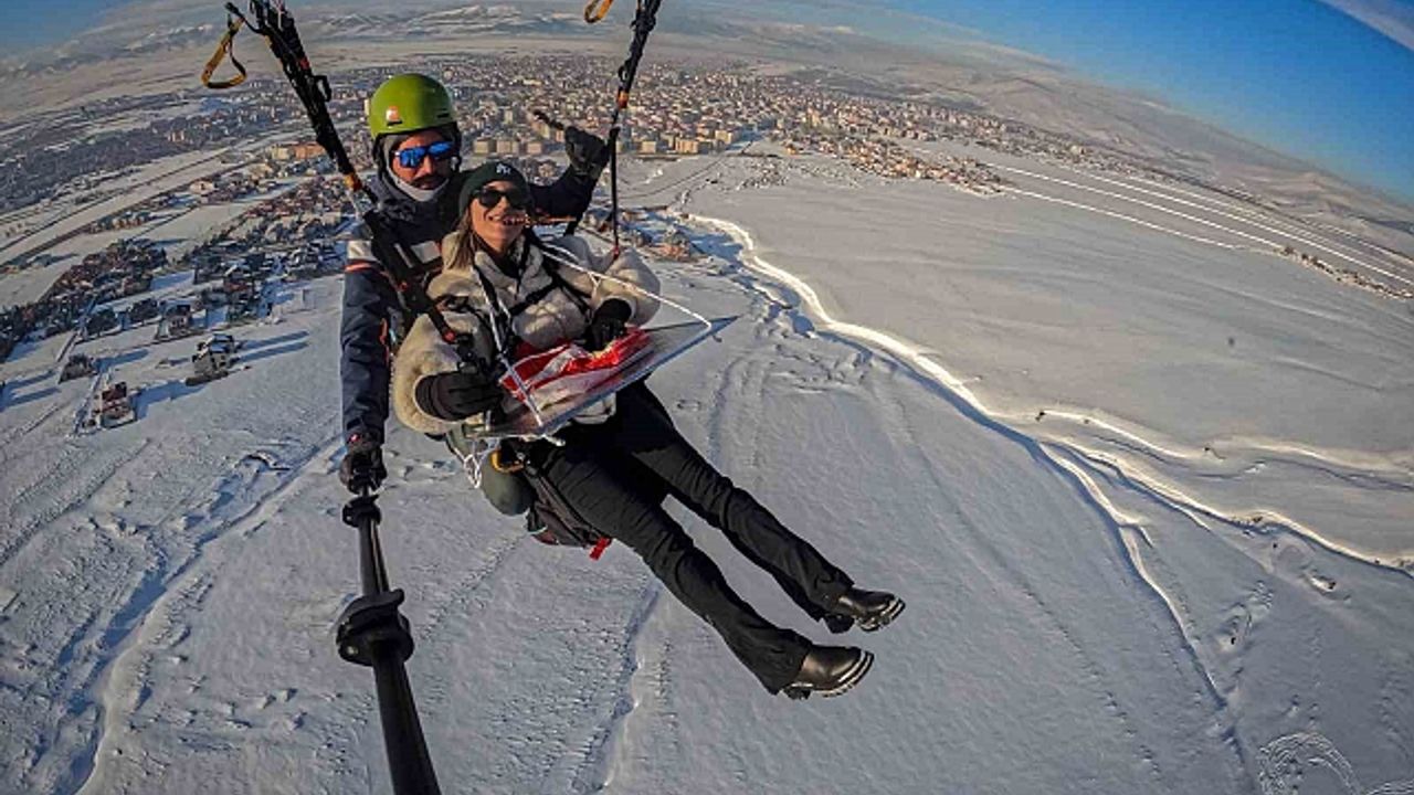 Palandöken''in 3100 rakımlı zirvesinde yamaç paraşütü ile süzülen Neşe Durdi ve Yusuf Okuyucu, Erzurum''un coğrafi işaretli yemeği olan cağ kebabını tadını çıkardılar.