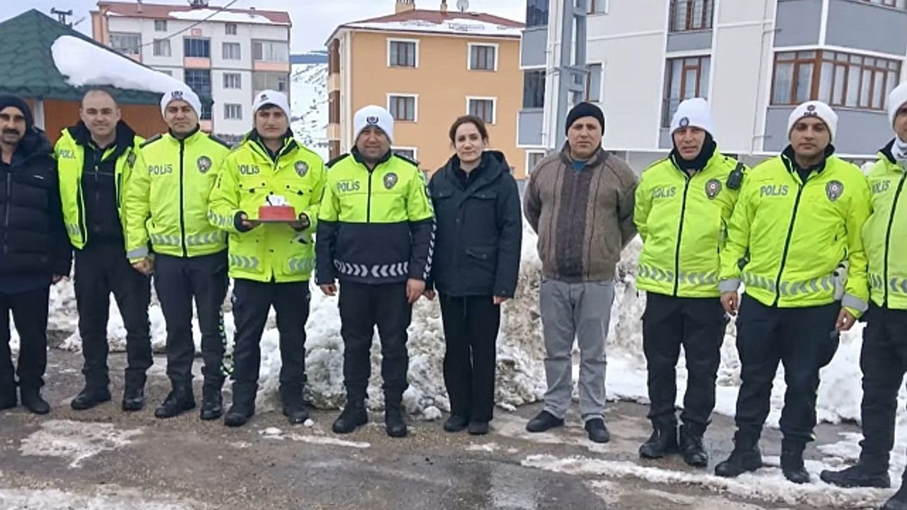 İlçedeki uygulama noktasında gerçekleştirilen sürpriz kutlamada polis memurunun doğum günü, ekip arkadaşlarınca eksi 15 derece hava sıcaklığında pasta kesilerek kutlandı.