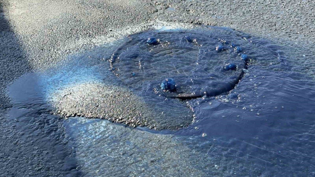 Mavi suyun caddeye yayılması hem vatandaşların cep telefonu kamerasıyla hem de dron kamerasıyla görüntülendi. Görüntülerde, kanalizasyondan taşan atık suyun yol boyunca aktığı ve çevreye yayıldığı anlar yer aldı.