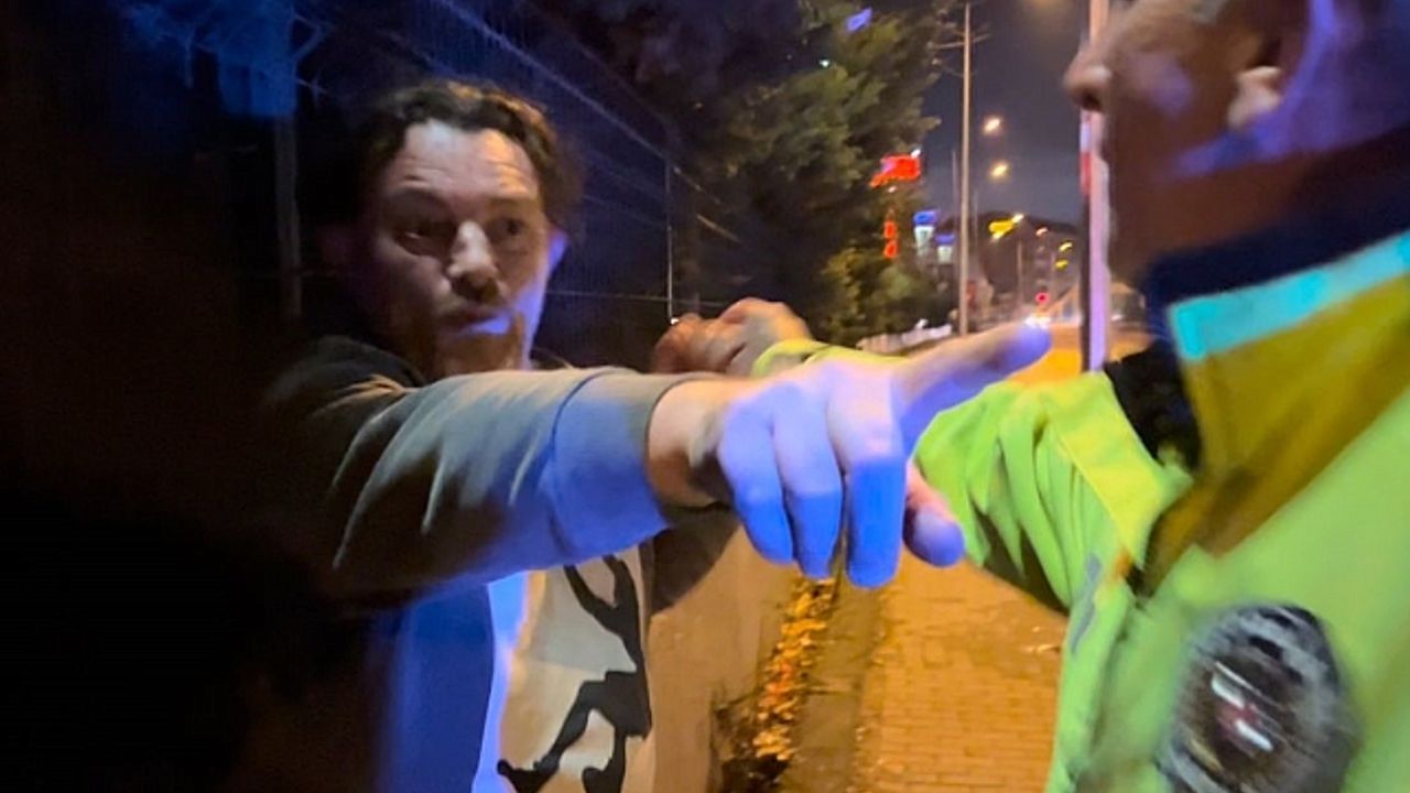 Aracın bağlanmasına sinirlenen Mustafa E., bir anda ekiplerin üzerine yürüyerek küfürler savuşturdu. Trafik polisinin "Ağzına sahip çık" demesi üzerine alkollü Mustafa E., "Çıkmıyorum lan", "Haritadan yer beğenin", "Sizin gideceğiniz yer belli oldu", "Savcı tanıdığım var" diyerek polisleri tehdit etti. Gazetecinin "Kime küfür ediyorsun" sorusuna "Polis memuruna" diye cevap veren Mustafa E., ekiplerce etkisiz hale getirildi. Olay yerine gelen asayiş ekipleri, mukavemet gösteren Mustafa E.''yi gözaltına alarak polis merkezine götürdü. Yaşanan olaydan sonra trafik polisleri Mustafa E.''den şikayetçi olurken, otomobil sürücüsü ve yolcuya çeşitli maddelerden toplamda 38 bin 931 lira para cezası kesildi. Ayrıca, Mustafa E.''nin yapılan üst aramasında bıçak ele geçirildi. Mustafa E.''nin emniyetteki işlemlerinin devam ettiği öğrenildi.