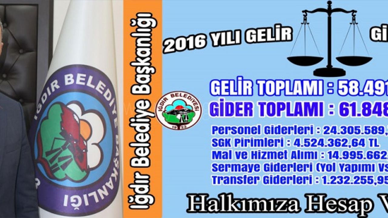 Iğdır Belediyesi 2016 yılı gelir gider hesaplarını billboardlarda açıklayarak şeffaf belediyecilik örneği sergilemeye devam ediyor.