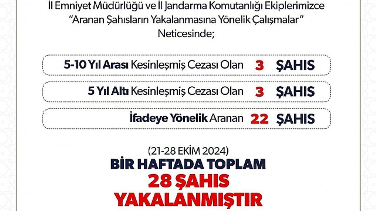 21-28 Ekim 2024 tarihleri arasında gerçekleştirilen operasyonlarda, aralarında kesinleşmiş hapis cezası bulunan kişilerin de olduğu toplam 28 şahıs yakalandı.