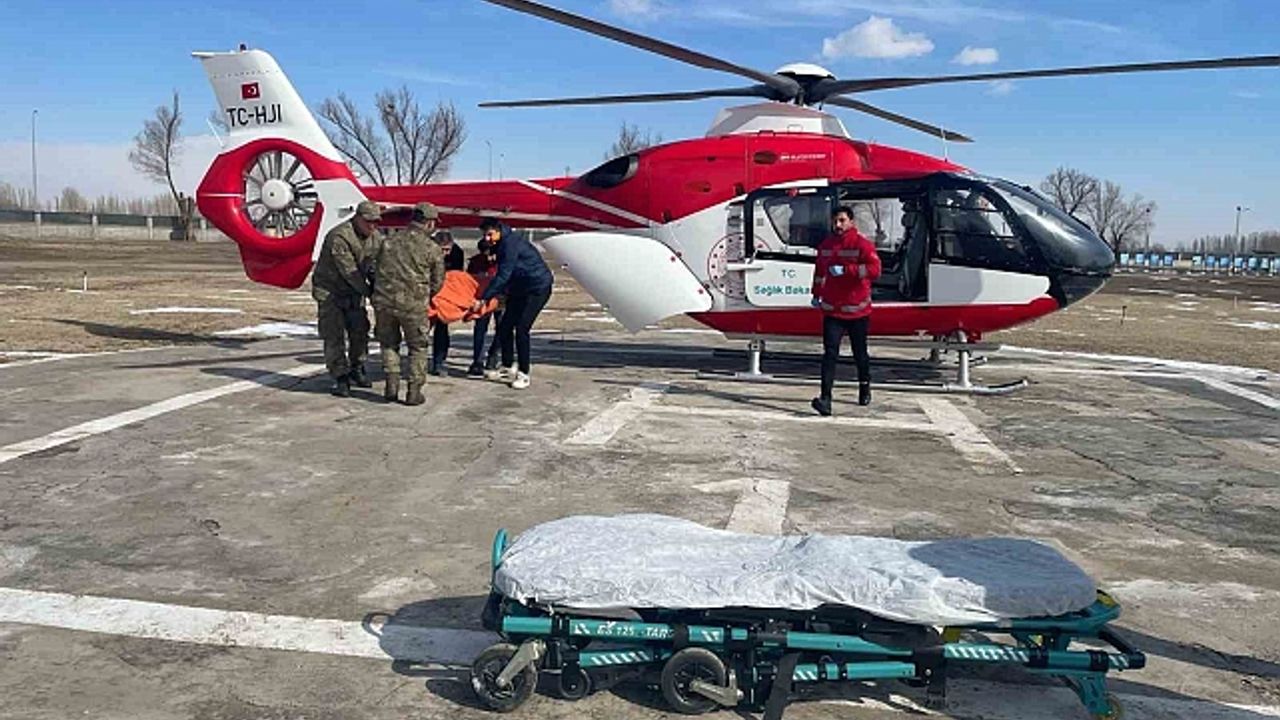 Iğdır''ın Tuzluca ilçesinde köyde rahatsızlanan hasta, yolların fırtına ve tipiden dolayı kapanması ile ambulans helikopterle hastaneye götürüldü.