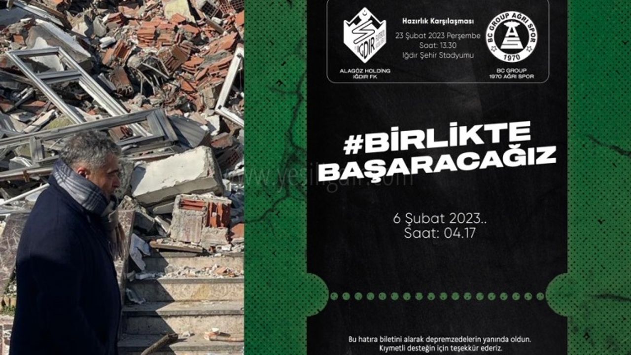 Alagöz Holding Iğdır FK Kulüp Başkanı Cantürk Alagöz gazetemiz genel yayın yönetmeni Cabbar Şıktaş"a yaptığı açıklamada: “Komşu takımımız CB Group Ağrı Spor ile önceden planlanan dostluk maçımızı Iğdır"da yapacağız. Deprem felaketinin ardından aldığımız kararla bu maç için bilet ücretlerini tribünlerde 100 ₺ protokolde ise 1.000 ₺ olarak belirledik. Sahamız 3 bin kişilik olsa da daha çok bilet satarak deprem yaralarının daha çok sarılmasına katkıda bulunmuş olacağız. Depremzedelerimiz için Türkiye Tek Yürek olmuştur. Iğdır"ımızın da deprem yardımında yüreklerini ortaya koyduklarını biliyorum. Bunu perşembe günü sahayı inleterek, bilet satışında rekor kırarak ortaya koyacağından hiç şüphem yoktur. Iğdır FK – CB Group Ağrı Spor taraftarlarının karma bir şekilde her iki takımı desteklerken görmek bizleri mutlu edecektir. Gün birlik günü, gün dayanışma günü, gün depremzedelere yardım elimizi uzatma günüdür.” Dedi.
