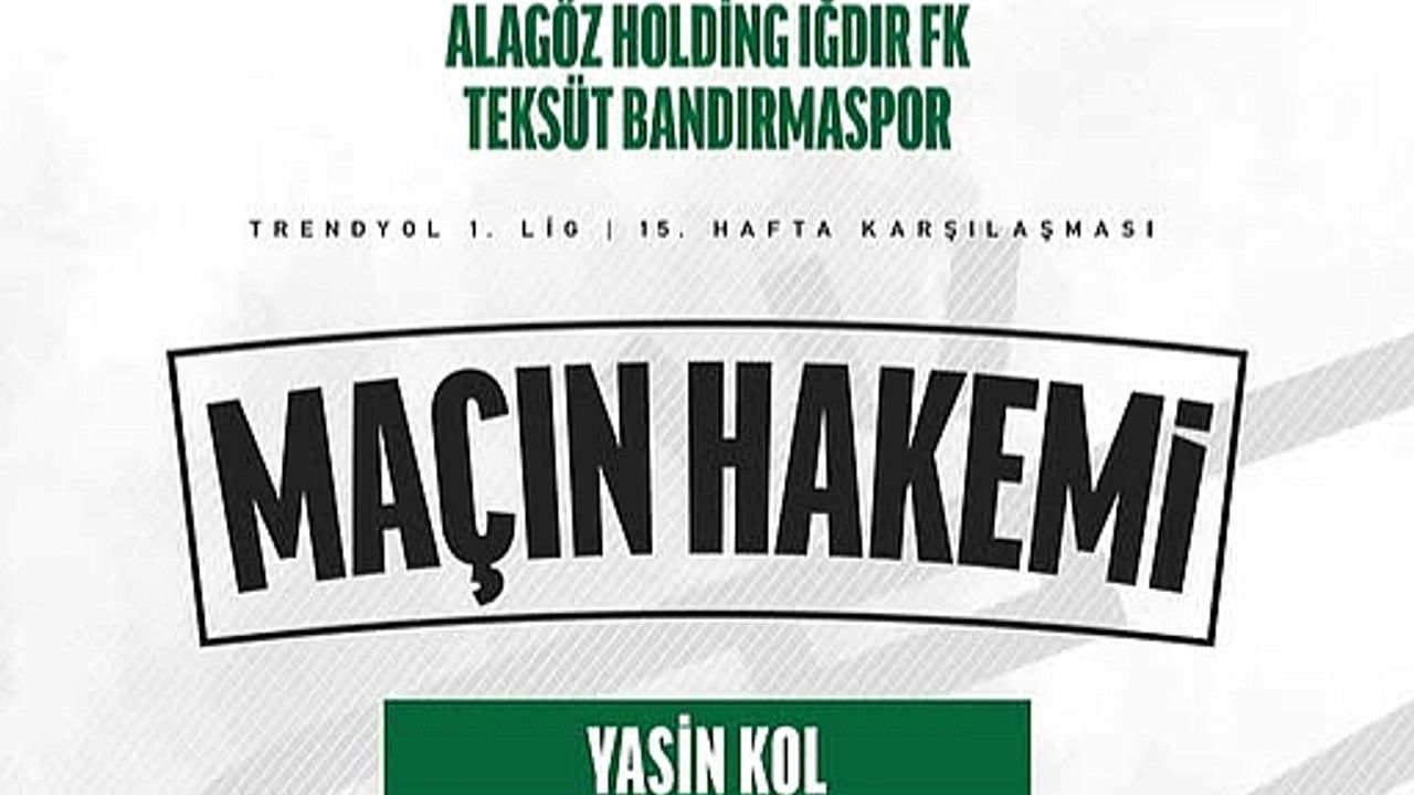 Trendyol 1. Lig"in 15. haftasında evimizde Teksüt Bandırmaspor ile oynayacağımız maçta karşılaşmayı hakem Yasin Kol yönetecek.