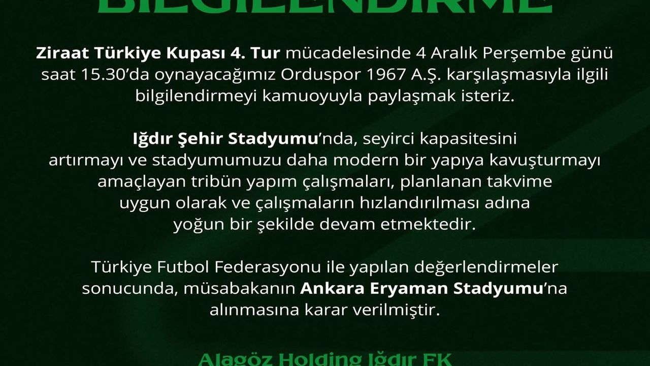 Iğdır FK’dan yapılan açıklamada, şehir stadyumunda yürütülen tribün yenileme ve kapasite artırma çalışmalarının planlandığı şekilde devam ettiği, stadyumun daha modern ve seyirci dostu bir yapıya kavuşturulmasının hedeflendiği belirtildi. Çalışmaların hızlandırıldığı ve güvenlik ile standartlar açısından oluşabilecek olumsuzlukların önüne geçmek için Türkiye Futbol Federasyonu ile yapılan görüşmeler sonucunda bu kararın alındığı ifade edildi.