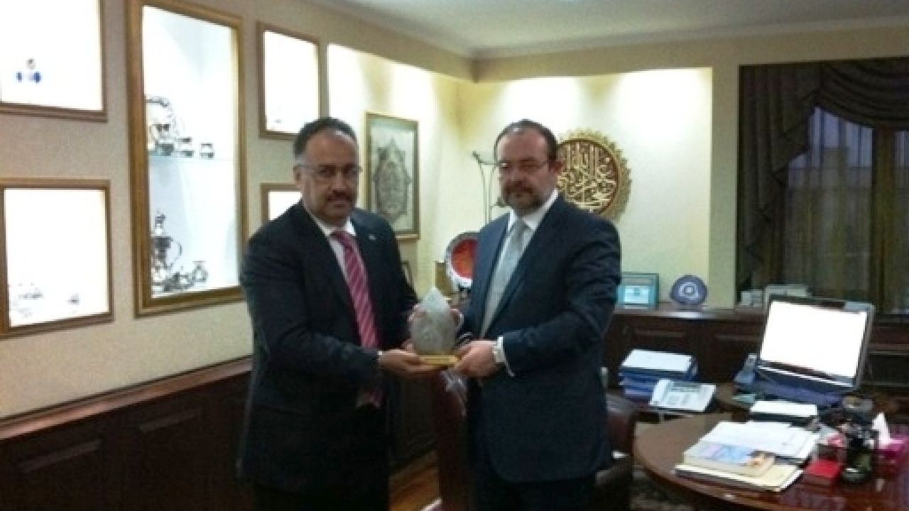 Iğdır Üniversitesi Rektörü Prof. Dr. İbrahim Hakkı Yılmaz Üniversiteler Arası Kurul"a katılmak üzere gittiği Ankara 'da Diyanet İşleri Başkanı Diyanet İşleri Başkanı Prof. Dr. Mehmet Görmez ile görüştü. Diyanet İşleri Başkanı Prof. Dr. Mehmet Görmez" in makamında gerçekleşen görüşmede Iğdır Üniversitesi Rektörü Prof. Dr. İbrahim Hakkı Yılmaz"a, Genel Sekreter Yrd. Doç. Dr. Bilal Keskin ve Yapı İşleri Daire Başkanı Musa Karakurt eşlik etti. Görüşmede, Iğdır Üniversitesi Rektörü Prof. Dr. İbrahim Hakkı Yılmaz"ın yapmış olduğu ziyaretin kendisini çok memnun ettiğini ifade eden Diyanet İşleri Başkanı Prof. Dr. Mehmet Görmez, Ülkemizin en doğusunda yükseköğretimin ışığını yaymak için çaba sarf eden bilim adamlarını ağırlamanın kendisini mutlu ettiğini söyledi. Ziyaretleri sırasında Diyanet İşleri Başkanı Prof. Dr. Mehmet Görmez tarafından çok sıcak karşılanan Rektör Prof. Dr. İbrahim Hakkı Yılmaz ve beraberindekiler, yoğun programına rağmen kendilerini misafir ettiği için Diyanet İşleri Başkanı Prof. Dr. Mehmet Görmez" e teşekkür ettiler. Ankara"da bulundukları süre içerisinde Iğdır Üniversitesinin çeşitli yatırımları ilgili olarak devletimizin yetkilileri ile temaslarda bulunduklarını belirten Prof. Dr. İbrahim Hakkı Yılmaz, inşaat çalışmaları devam eden Suveren Yerleşkesi içerisinde yapılacak olan camii inşaatı hakkında görüş alış verişinde bulunmak üzere ziyaret ettiklerini aktardı. Diyanet İşleri Başkanı Prof. Dr. Mehmet Görmez görüşme sırasında, Suveren Yerleşkesinde yapılacak olan cami inşaatı Diyanet İşleri Başkanlığı olarak her türlü desteği verecekleri vurguladı. Ziyaretin sonunda Iğdır Üniversitesi Rektörü Prof. Dr. İbrahim Hakkı Yılmaz, Diyanet İşleri Başkanı Prof. Dr. Mehmet Görmez" e ziyaretin anısına kaya tuzundan yapılan el emeği bir lamba hediye etti.