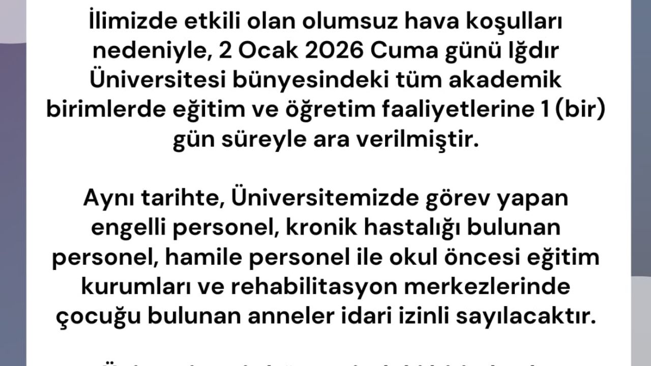 Iğdır'da olumsuz hava şartları nedeniyle Iğdır Üniversitesi'nde eğitime Cuma günü ara verildi.