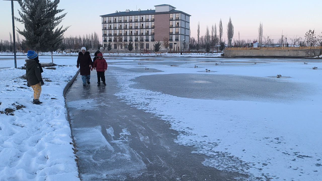 Soğuk havaya rağmen çocuklar donan gölün çevresinde kayarak eğlenceli anlar yaşadı. Çocuklar, “Hava çok soğuk ama donan gölün kenarında kaymak çok güzel” diyerek keyifli anlarını dile getirdi.