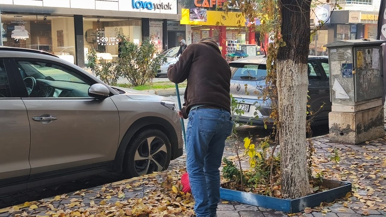 “Sonbaharın güzelliğini yaşıyoruz, yapraklar birer birer dökülüyor. Bizler de aşırı dökülmeden dolayı ara ara yaprakları iş yerimizin önünden süpürerek topluyoruz. Toplamasak, yağmur yağması ile birlikte kanalizasyon giriş yerini tıkıyor. Bu nedenle elimizden geldiğince temizlemeye çalışıyoruz.”