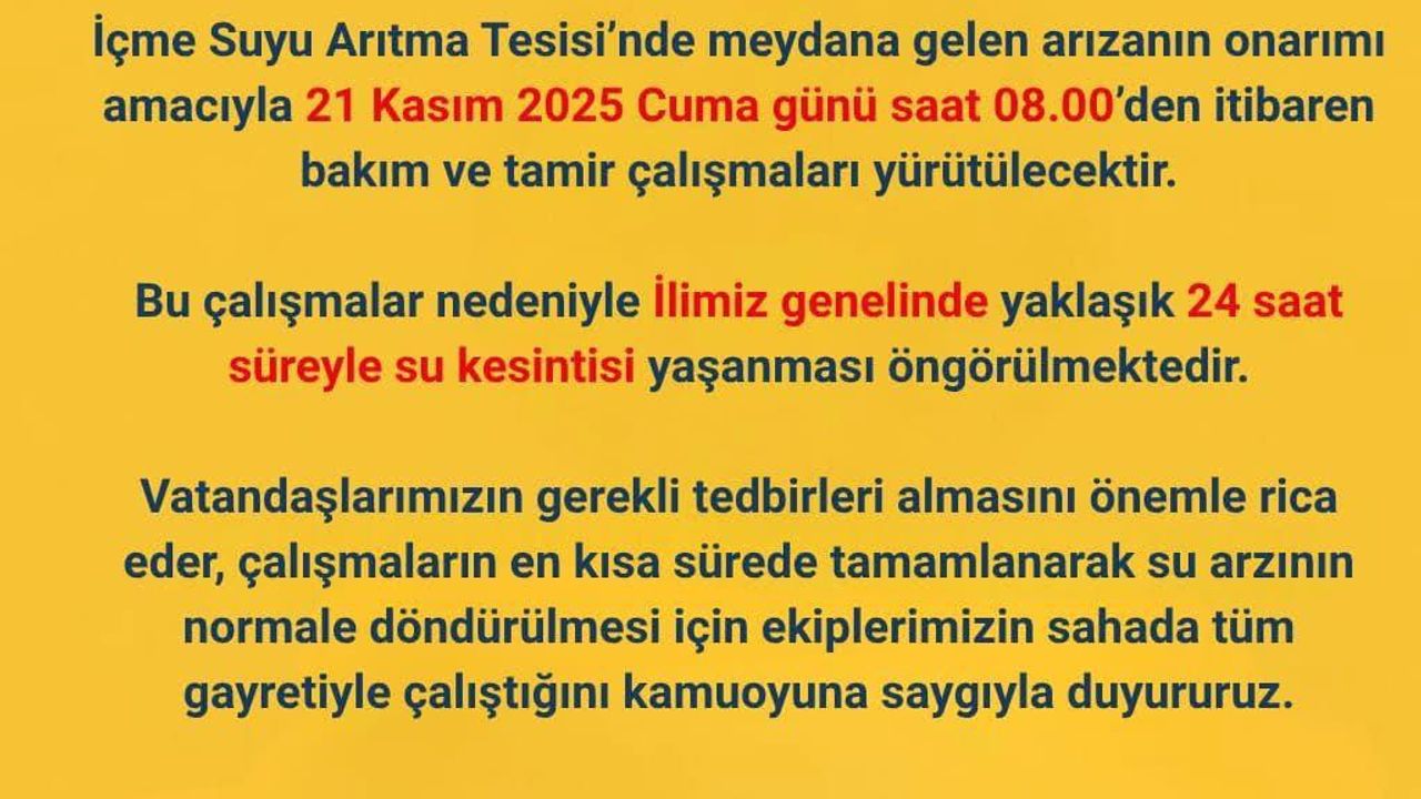 Belediyeden yapılan açıklamaya göre, 21 Kasım 2025 Cuma günü saat 08.00’den itibaren kent genelinde yaklaşık 24 saat süreyle su kesintisi uygulanacak.