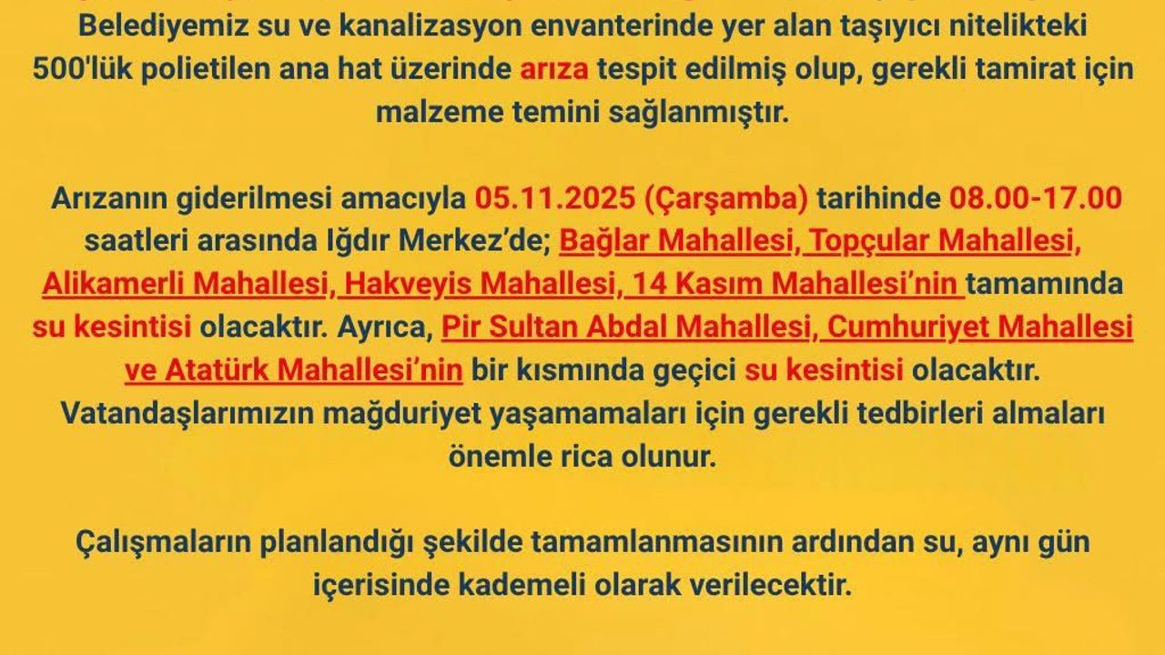 Açıklamaya göre 05 Kasım 2025 Çarşamba günü 08.00 – 17.00 saatleri arasında Iğdır Merkez’e bağlı Bağlar Mahallesi, Topçular Mahallesi, Alikamerli Mahallesi, Hakveyis Mahallesi ve 14 Kasım Mahallesi’nin tamamında su kesintisi uygulanacak. Ayrıca Pir Sultan Abdal Mahallesi, Cumhuriyet Mahallesi ve Atatürk Mahallesi’nin bir kısmında da geçici kesinti yaşanacak.