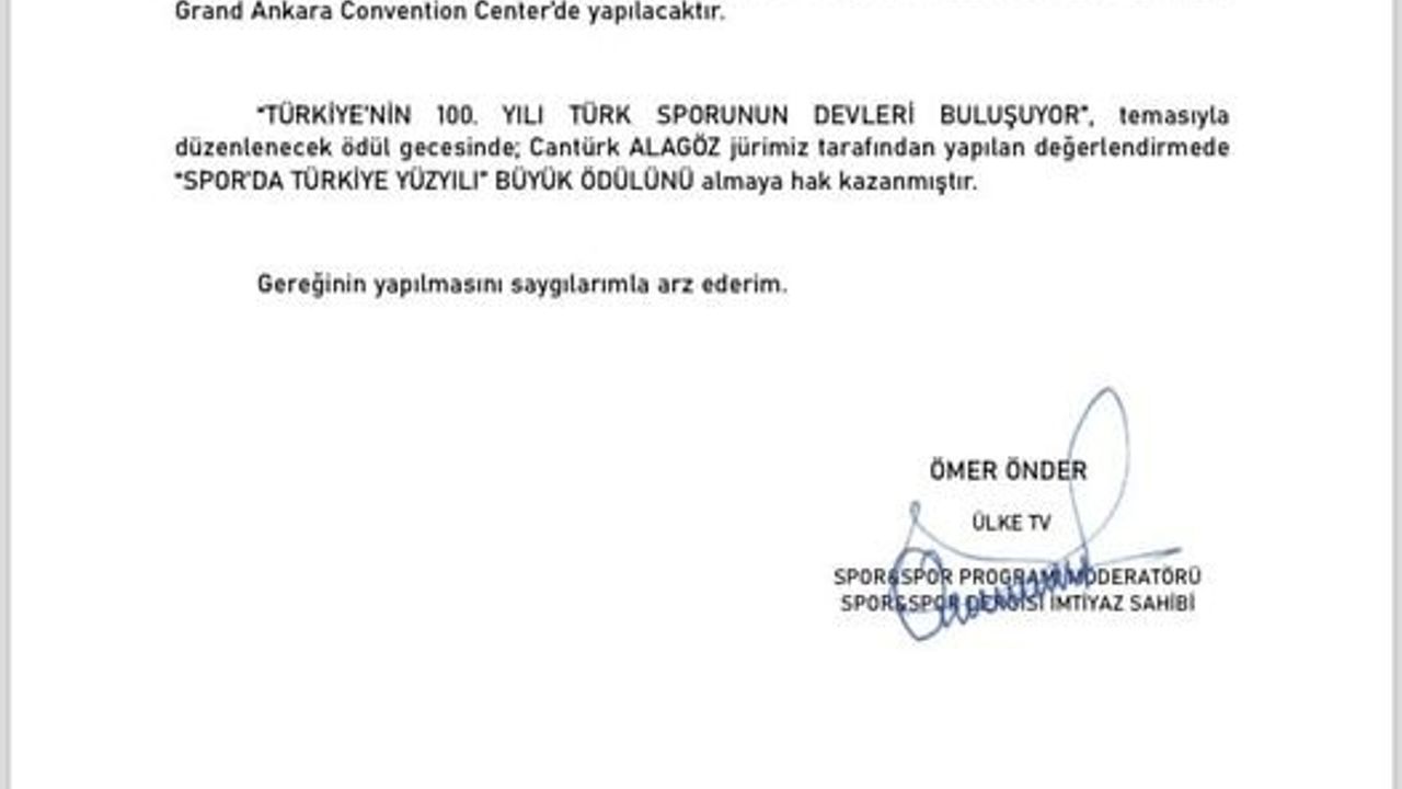 ALAGÖZ HOLDİNG YÖNETİM KURULU BAŞKANLIĞI"NA ÜLKE TV"de yayınlanmakta olan Spor&Spor Programı ve Dergisi"nin geleneksel olarak düzenlediği, bu yıl 8.cisini gerçekleştireceği Ödül Töreni 28 Kasım 2023 saat 20:00 tarihinde Grand Ankara Convention Center"de yapılacaktır.