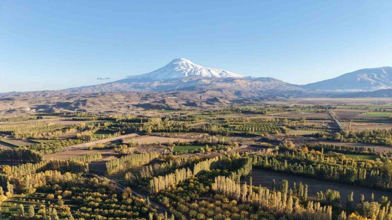 Ağrı Dağı’nın kuzey eteklerinde, Iğdır’ın Melekli beldesinde yer alan İrem Bağları, sonbaharın gelişiyle birlikte adeta renklerin dans ettiği bir tabloya dönüştü.