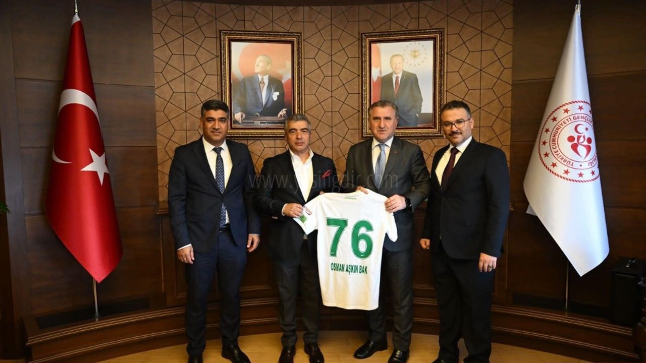 Iğdır heyetini samimi bir ortamda ağırlayan Gençlik ve Spor Bakanı Osman Aşkın Bak"a, isminin yazılı olduğu Iğdır FK forması hediye edildi. Haber: Zeki Şıktaş
