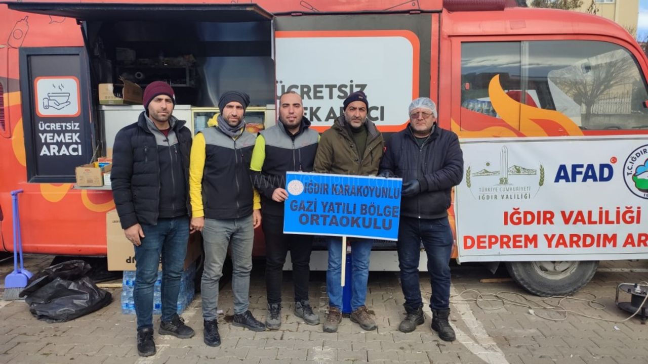 Iğdır"a bağlı Karakoyunlu ilçesi Gazi Yatılı bölge okulu Müdürü, öğretmen ve aşçılarıyla birlikte Adıyaman"ın Gölbaşı ilçesinde depremzedelere üç öğün yemek veriyor.