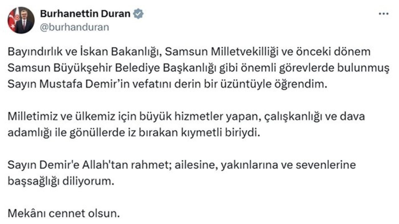 Sosyal medya hesabından paylaşımda bulunan Duran, "Bayındırlık ve İskan Bakanlığı, Samsun Milletvekilliği ve önceki dönem Samsun Büyükşehir Belediye Başkanlığı gibi önemli görevlerde bulunmuş Sayın Mustafa Demir"in vefatını derin bir üzüntüyle öğrendim" ifadelerini kullandı.
