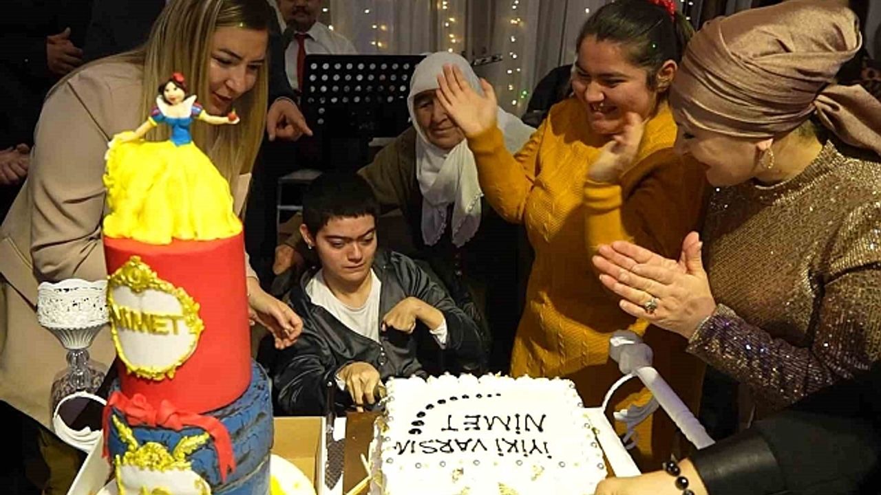 Kırıkkale''de dedesi ve babaannesiyle birlikte yaşayan fiziksel engelli Nimet Akdağ, 19. yaş gününe özel düzenlenen etkinlikle hayatında bir ilki yaşadı. Umuda Yolculuk Derneği''nin organizasyonuyla Kırıkkale Belediyesi Düğün Salonu''nda düzenlenen kutlama, renkli anlara sahne oldu. İl Kültür ve Turizm Müdürlüğü Ustalar Topluluğu''nun şarkılarıyla keyifli bir hale gelen etkinlikte, doğum günü pastasının kesildiği anlar mutluluk ve gözyaşlarını bir araya getirdi.