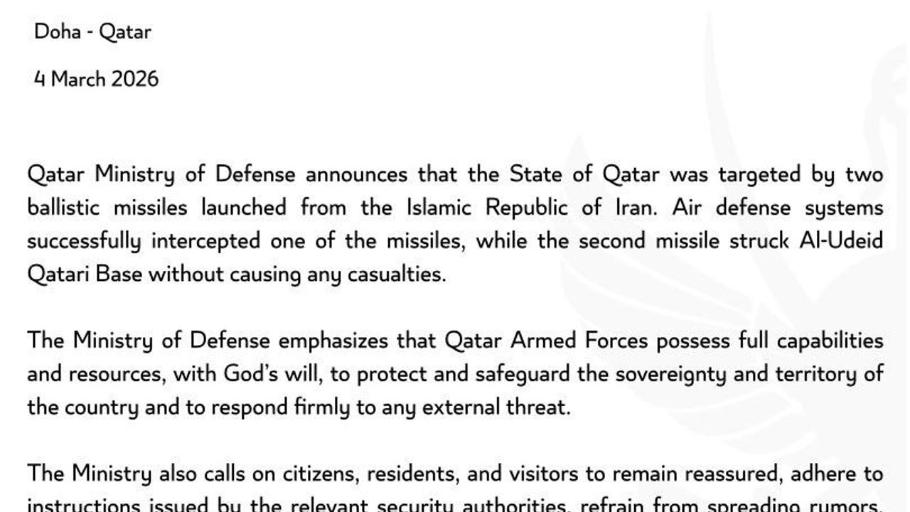 Katar Savunma Bakanlığı'ndan yapılan açıklamada, İran'dan fırlatılan 2 balistik füzeden birinin ABD tarafından kullanılan El-Udeid Hava Üssü'ne isabet ettiği, ancak saldırıda herhangi bir can kaybı yaşanmadığı bildirildi. El-Udeid Hava Üssü, ABD'nin Orta Doğu bölgesindeki en büyük askeri üssü olarak biliniyor.