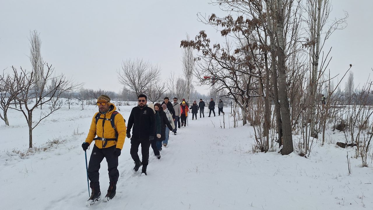 Mikroklima iklimi nedeniyle “Doğu’nun Çukurovası” olarak adlandırılan Iğdır’da, kar yağışıyla birlikte kartpostallık görüntüler oluşurken Beyaz örtüyle kaplanan meyve ağaçları ve taş duvarlar arasında yapılan yürüyüş, katılımcılara eşsiz bir görsel şölen sundu.