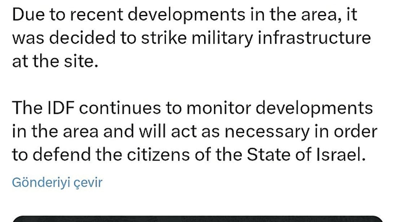 İsrail ordusu bir kez daha Suriye''yi hedef aldı. İsrail Savunma Kuvvetleri''nden (IDF) yapılan açıklamada, Lazkiye''ye bağlı Kardaha ilçesinde bulunan eski Suriye rejimine ait silahların depolandığı bir askeri bölgeye hava saldırısı düzenlendiği bildirildi. "Son gelişmeler nedeniyle bölgedeki askeri altyapının vurulmasına karar verildi" denilen açıklamada, "IDF bölgedeki gelişmeleri izlemeye devam ederek İsrail''in güvenliği için gerekli adımları atacaktır" ifadeleri kullanıldı.