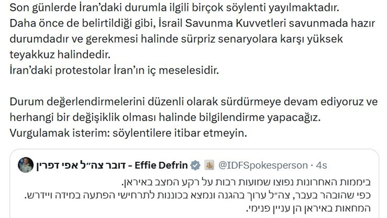 İsrail ordusunun İran'daki gelişmelerle ilgili düzenli değerlendirmeler yapmayı sürdürdüğü vurgulanan açıklamada, 'Pozisyonumuzda herhangi bir değişiklik olması halinde bilgilendirme yapacağız. Vurgulamak isterim: Söylentilere itibar etmeyin' denildi.