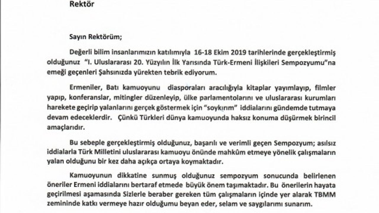 İstanbul Milletvekili Şamil Ayrım, Rektör Alma"ya hitaben yazdığı tebrik mektubunda; Ermenilerin “soykırım” iddialarını gündemde tutmak ve dünya kamuoyunda “Türkleri haksız duruma düşürmek” için faaliyetlerine devam ettiğini belirterek; “Bu sebeple gerçekleştirmiş olduğunuz, başarılı ve verimli geçen Sempozyum; asılsız iddialarla Türk Milletini uluslararası kamuoyu önünde mahkum etmeye yönelik çalışmaların yalan olduğunu bir kez daha açıkça ortaya koymaktadır.” ifadelerini kullandı.