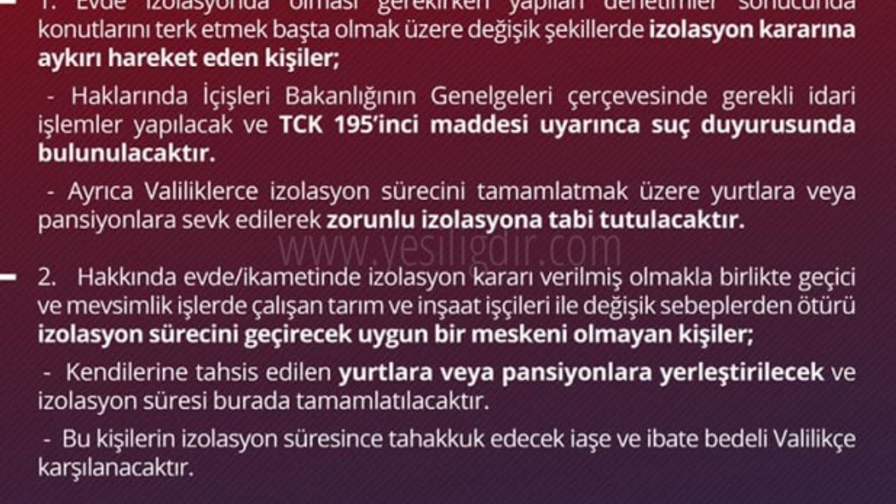 - Ayrıca Valiliklerce izolasyon sürecini tamamlatmak üzere yurtlara veya pansiyonlara sevk edilerek zorunlu izolasyona tabi tutulacaktır.
