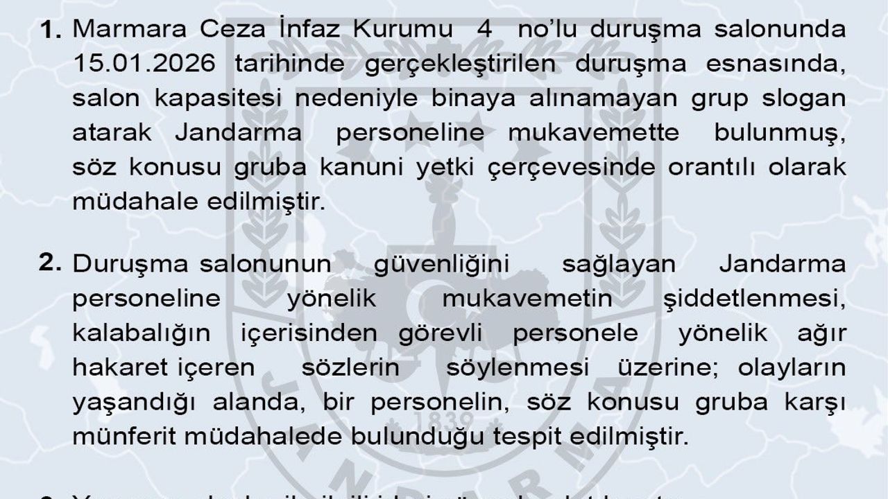 Jandarma Genel Komutanlığı'nın sosyal medya hesabından, Marmara Ceza İnfaz Kurumu 4 no'lu duruşma salonunda 15 Ocak Perşembe jandarma ile binaya alınmayan bir grup arasında çıkan olaya ilişkin açıklama yapıldı. Açıklamada, 'Marmara Ceza İnfaz Kurumu 4 no'lu duruşma salonunda 15 Ocak Perşembe günü gerçekleştirilen duruşma esnasında, salon kapasitesi nedeniyle binaya alınamayan grup slogan atarak Jandarma personeline mukavemette bulunmuş, söz konusu gruba kanuni yetki çerçevesinde orantılı olarak müdahale edilmiştir. Duruşma salonunun güvenliğini sağlayan Jandarma personeline yönelik mukavemetin şiddetlenmesi, kalabalığın içerisinden görevli personele yönelik ağır hakaret içeren sözlerin söylenmesi üzerine; olayların yaşandığı alanda, bir personelin, söz konusu gruba karşı münferit müdahalede bulunduğu tespit edilmiştir. Yaşanan olaylar ile ilgili idari süreç başlatılmıştır' ifadelerine yer verildi.