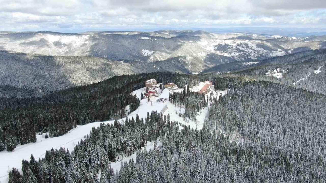 Meteoroloji Müdürlüğü'nün soğuk hava tahmininde bulunduğu Kastamonu'da dün yüksek kesimlerde kar yağışı etkili oldu. Kastamonu ve Çankırı sınırlarında yer alan Ilgaz Dağı Milli Parkı'nda da kar yağışı ara ara etkili olmaya devam ediyor. Kar yağışı sonrasında Ilgaz Dağı beyaz örtüyle kaplandı. Sabah saatlerinde güneşin yüzünü göstermesiyle birlikte Ilgaz Dağı'nın zirvesi ve ormanlık alanlarda kışı aratmayan manzaralar ortaya çıktı. Görsel şölen sunan Ilgaz Dağı, havadan görüntülendi.