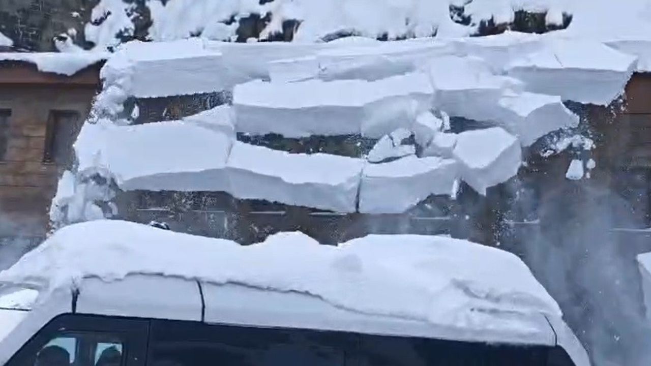 Bitlis'te bir binanın çatısında biriken tonlarca ağırlıktaki kar kütlesinin iş makinesinin üzerine düşmesi paniğe neden oldu.