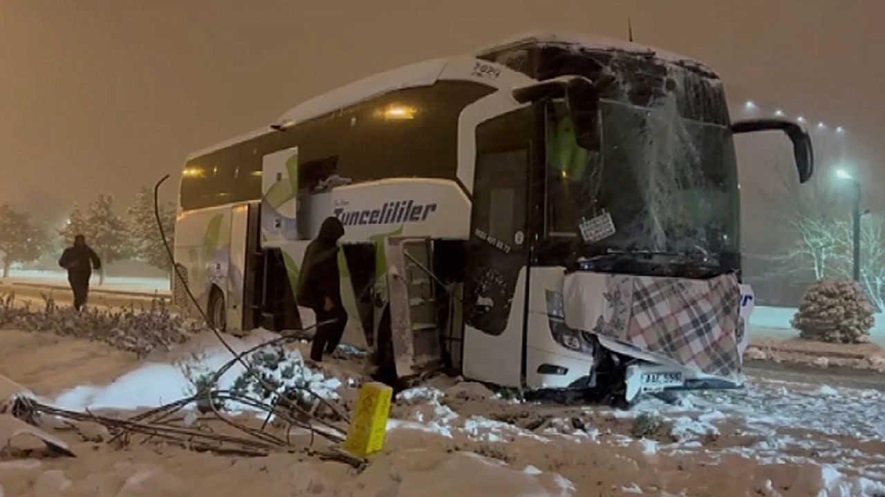 Erzincan''da yoğun kar yağışı kazaları da beraberinde getirdi. Karda kayan yolcu otobüsü aydınlatma direğine çarptı, 2 kişi yaralandı.