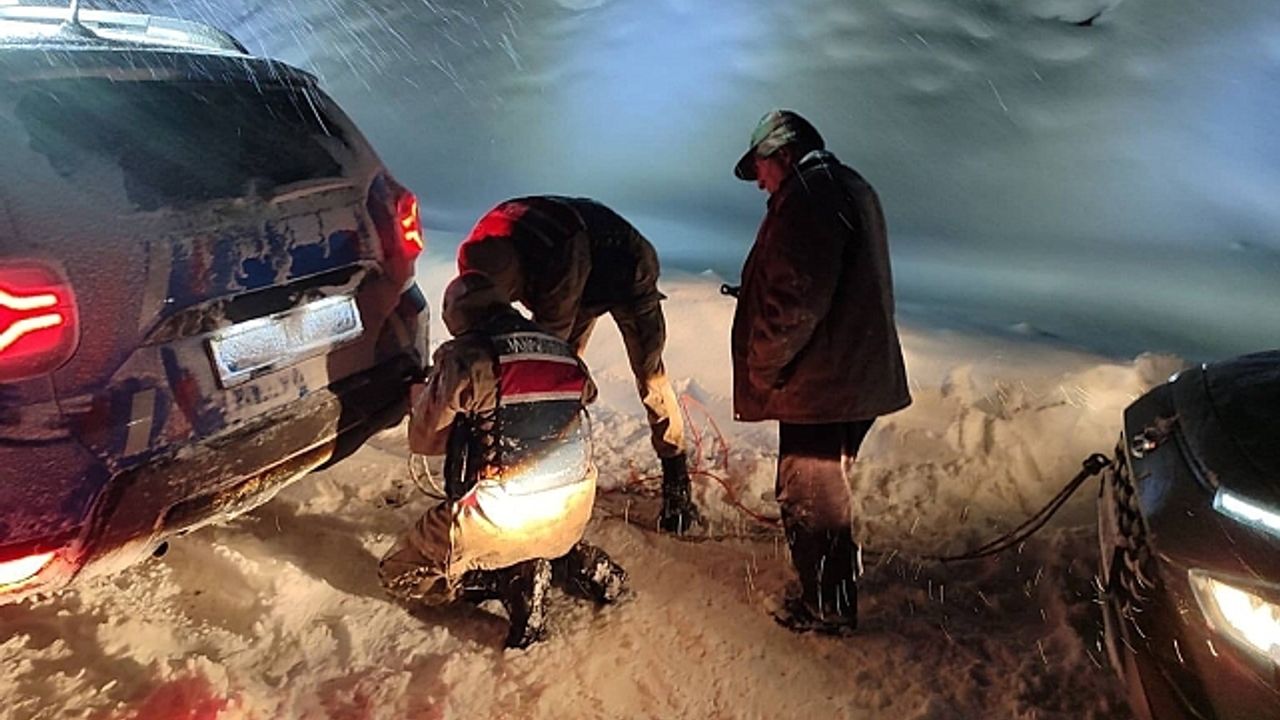 Erzurum''da jandarma ekipleri karda mahsur kalan vatandaşa ulaştı ve aracıyla birlikte kurtarıldı.