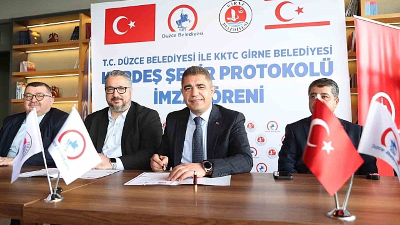 Düzce Belediye Başkanı Dr. Faruk Özlü''nün önerisi ile Belediye Meclisi''nde görüşülerek karara bağlanan "Girne ile Kardeş Şehir İlanı" Girne''den Düzce''ye gelen heyetin de katılımıyla düzenlenen protokol imza töreni ile resmiyet kazandı. Protokol kapsamında iki şehir arasında tarım, turizm ve sanayi alanlarında ortak projeler üretilerek uygulanacak.