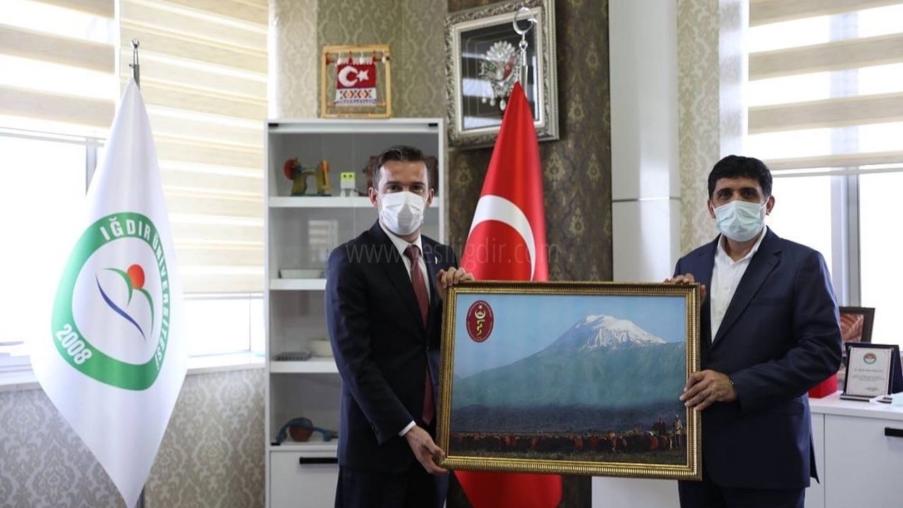 Ziyarette ikinci kez Iğdır Üniversitesi Rektörlüğüne atanan Prof. Dr. Mehmet Hakkı Alma"yı tebrik dileklerini ilettikleri görüşmede Iğdır Üniversitesi ile Bölge Veteriner Hekimleri Odası arasında yürütülmesi planlanan fakat pandemi nedeniyle ertelenen ortak projelere hız verilmesi konusunda görüş birliğine varıldı.