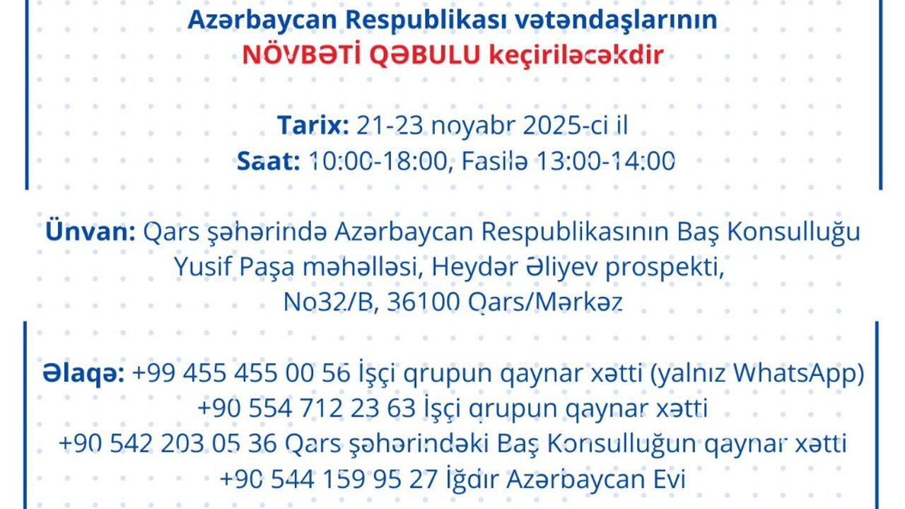 Çalışma Grubu tarafından 21-23 Kasım 2025 tarihleri arasında, Türkiye Cumhuriyeti’nin Kars şehrinde bulunan Azerbaycan Cumhuriyeti Başkonsolosluğunun konsolosluk bölgesine dahil olan yerleşim bölgelerinde (Ağrı, Ardahan, Adıyaman, Artvin, Batman, Bayburt, Bitlis, Bingöl, Diyarbakır, Erzurum, Elazığ, Erzincan, Hakkari, Iğdır, Kars, Malatya, Mardin, Muş, Rize, Tunceli, Trabzon, Van, Giresun, Gümüşhane, Ordu, Siirt, Şırnak, Şanlıurfa) belgesiz yaşayan Azerbaycan vatandaşlarının kabulü gerçekleştirilecektir.