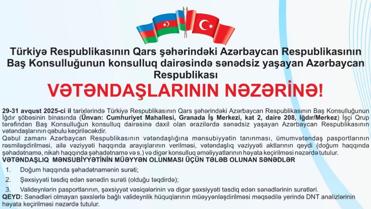 29-31 Ağustos 2025 tarihleri arasında, Başkonsolosluğun Iğdır şubesinde özel bir çalışma grubu tarafından vatandaş kabulü gerçekleştirilecek.