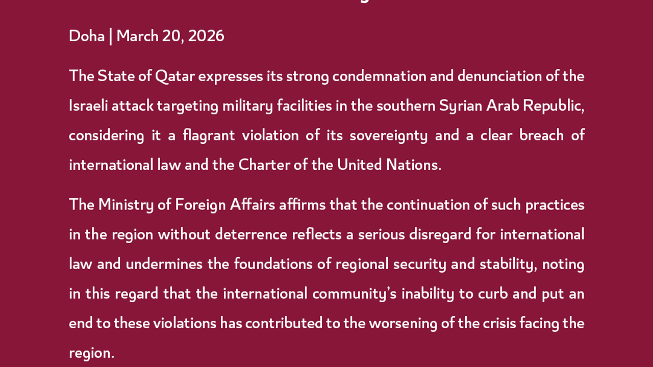 Katar Dışişleri Bakanlığı'ndan yapılan açıklamada, İsrail'in Suriye'deki askeri altyapılara yönelik saldırıları şiddetle kınanarak, 'Bunu, Suriye'nin egemenliğinin ve uluslararası hukuk ile Birleşmiş Milletler Sözleşmesi'nin açık bir ihlali olarak görüyoruz' denildi.