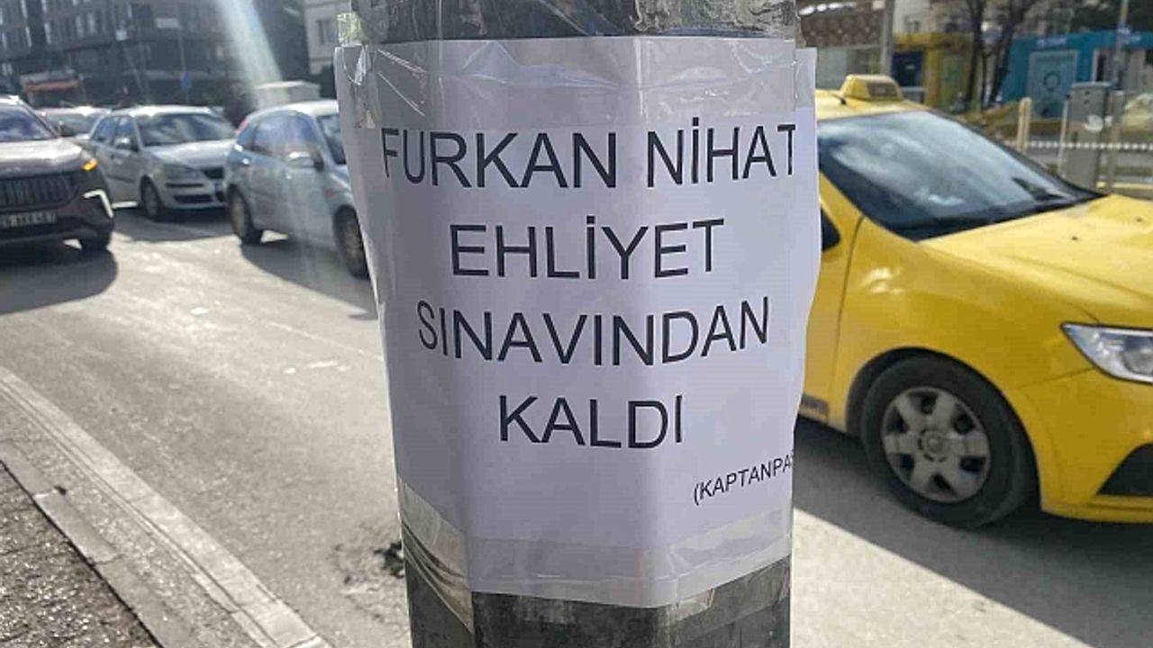 Eskişehir''de bir direğin üzerine yapıştırılan, "Furkan Nihat ehliyet sınavından kaldı" yazısı görenlerin dikkatini çekti.