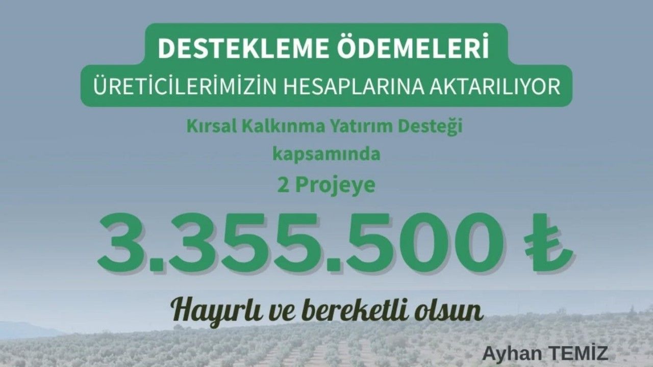 Aydın İl Tarım ve Orman Müdürlüğü, üreticilere yönelik destek ödemelerine devam ediyor. Kırsal Kalkınma Yatırımları Destekleme Programı kapsamında, il genelinde hayata geçirilen 2 projeye toplam 3 milyon 355 bin 500 TL tutarında hibe ödemesi üreticilerin hesaplarına aktarılıyor. İl Tarım ve Orman Müdürü Ayhan Temiz, yapılan desteklerin üreticilerin güçlenmesine ve kırsal ekonominin sürdürülebilirliğine katkı sunduğunu belirterek, "Kırsalda üretim var, bereket var, Türkiye’nin geleceği var" ifadelerini kullandı.