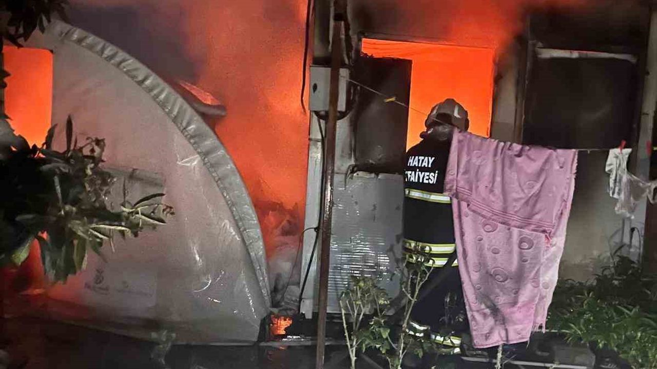 Hatay'da çıkan yangında depremzede ailenin yaşadığı konteyner ve depo olarak kullanılan çadır yanarak kullanılmaz hale geldi.
