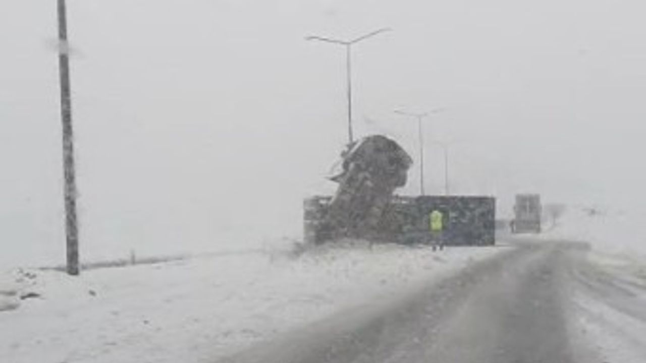 Bitlis'te etkili olan olumsuz hava şartları nedeniyle kontrolden çıkan tır yan yattı.